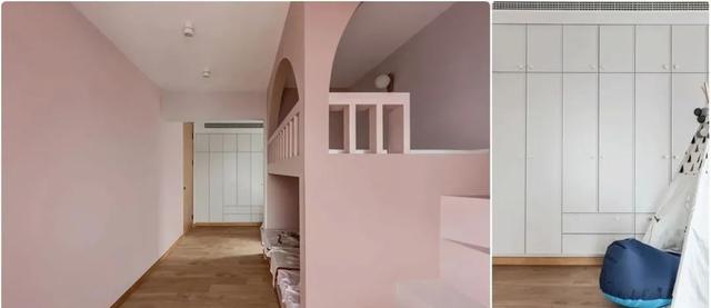 另一边的空间留给了收纳和玩耍,现场制作了顶天立地的嵌入式衣柜,空间足够承载两个女孩的成长。
