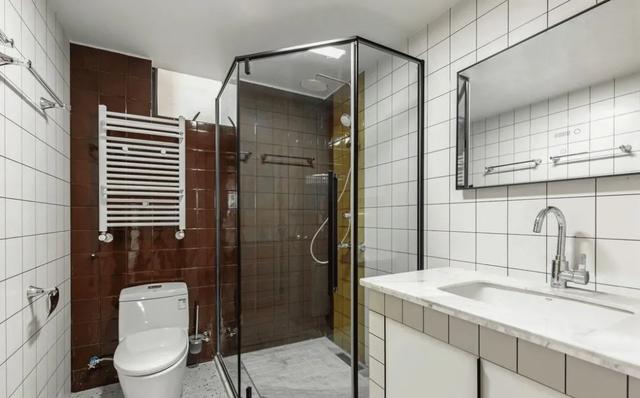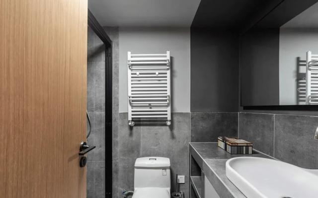 主卫用了有磨砂触感的浅灰色瓷砖,以及炭灰色和白色的涂料拼接,利用不同的几何色块打破空间的狭小。