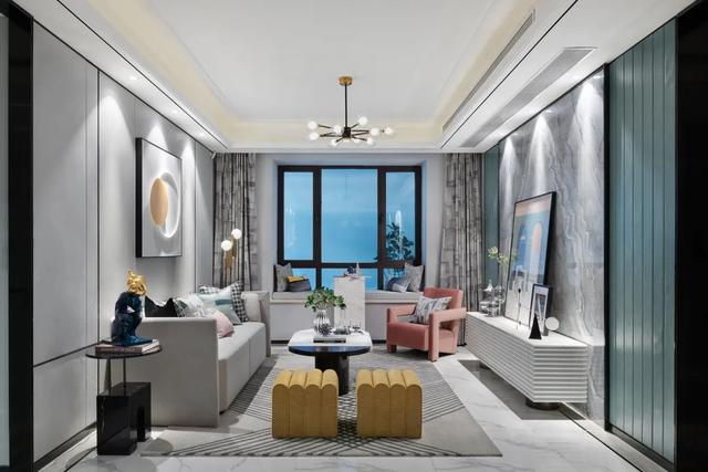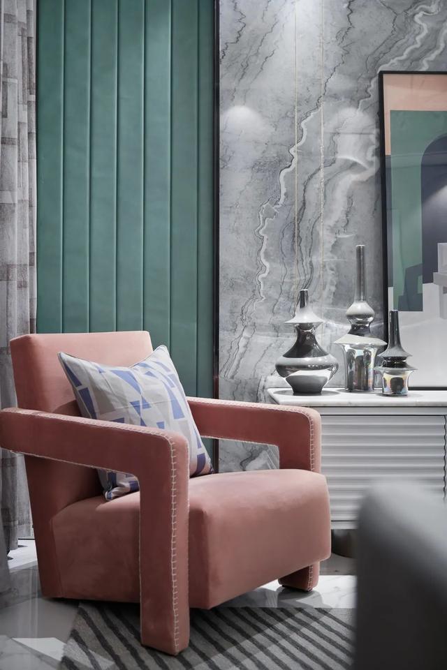 现代轻奢风格,在现代优雅的硬装空间基础上,让空间细节与家具布置中加入轻奢风的元素,最后搭鲜艳活泼的软装,营造出一种优雅时尚的高级空间感。