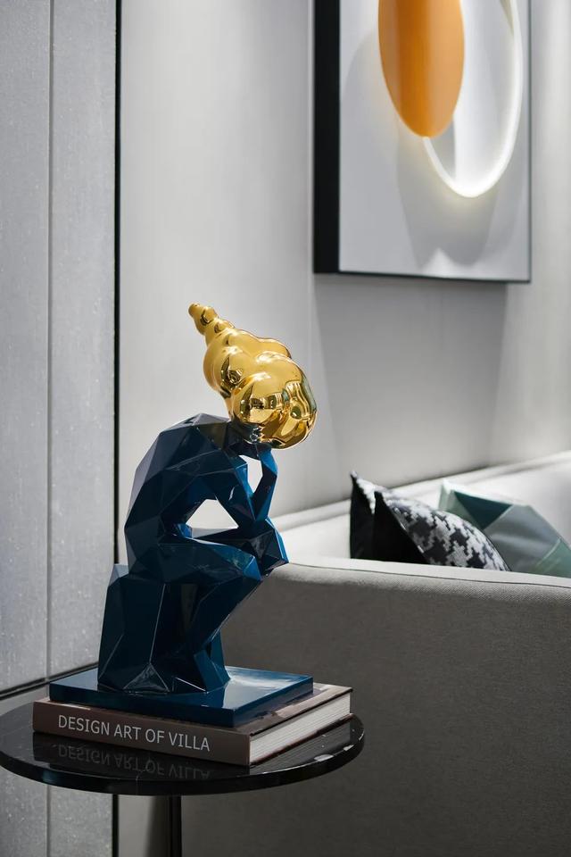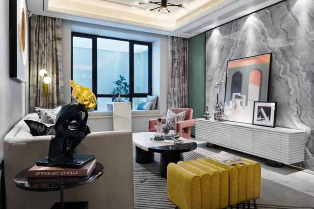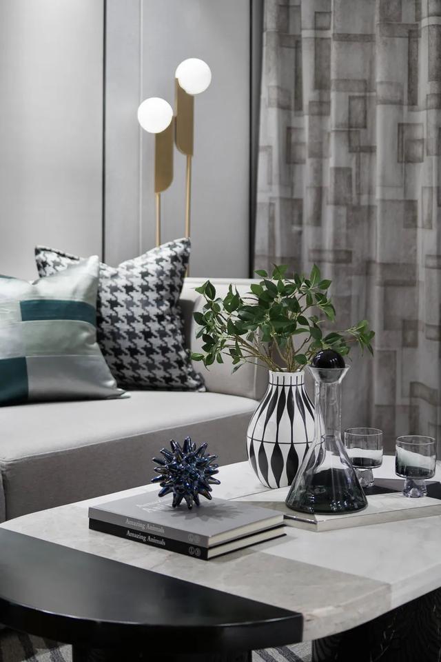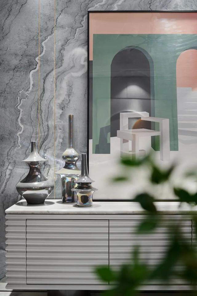 ▲电视墙是对称图案的大理石背景,灰白配的纹理线条,布置端庄优雅的电视柜,还布置了立体几何感的装饰画与摆饰品,与现代活泼的整体布置相呼应,带来的是一种高级优雅的空间感。