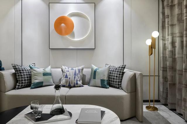 ▲沙发墙以硬包背景墙基础,挂上一副方形的装饰画,画面内容是一个圆环+黄色的圈圈,布置灰色沙发,侧边的金属落地灯,呈现出一种华丽活泼的高级画面感。