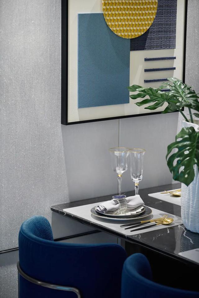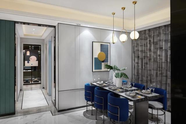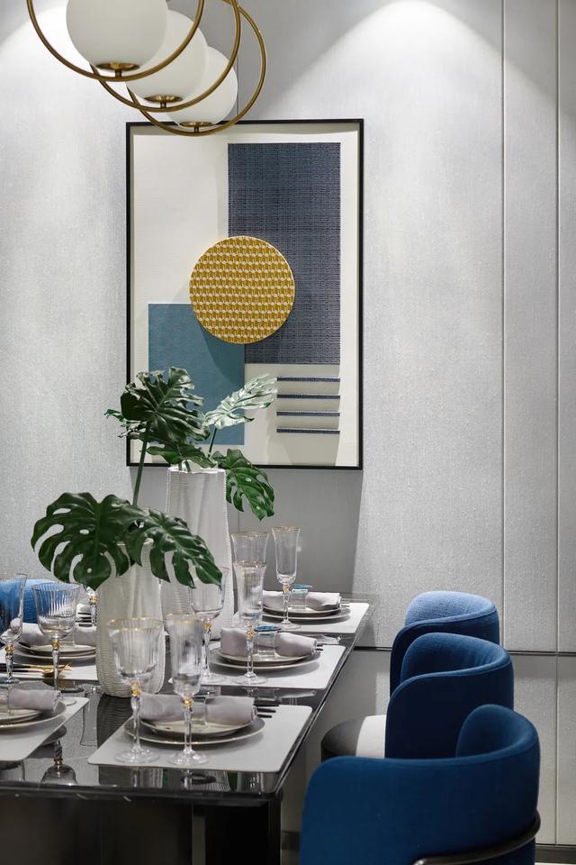 ▲餐厅侧边墙面装上硬包,挂一幅结合与色彩鲜明的装饰画,布置黑色石材台面的餐桌,还有深蓝色的餐椅布置,顶上三盏金属质感的球形吊灯,使得用餐氛围也端庄优雅而华丽大气。