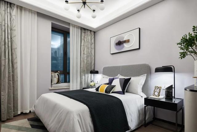 ▲床尾的斗柜黑色柜体+米白色柜门,柜门还有金属质感的拉手,台面上布置花瓶与陶艺装饰头像,靠一幅静雅端庄的装饰画,营造出一种温馨华丽的高级浪漫气质。