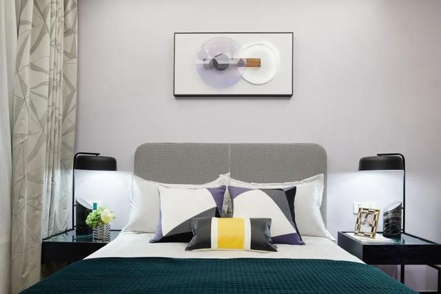▲次卧整体空间相对简洁,灰色的乳胶漆墙面,床头墙挂上圆形的装饰画,布置格纹花纹的布艺靠背床铺,在现代高级的床单与床头柜等布置下,也是显得更加端庄时尚而舒适。