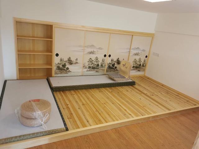 楼上是房间,也是沿袭了日式榻榻米风格,榻榻米上放置的蒲团,一下就把我们带到了东京。墙上也做了入墙式收纳,配以山水画㕑门,很有禅意。