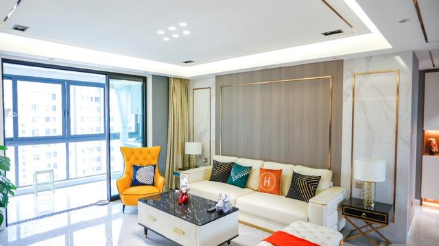 ▲茶几以金属+大理石质感的结合设计,茶几台面上布置上的摆饰品,搭配边上的黄色皮质沙发,整个空间给人的感觉也是轻奢优雅。