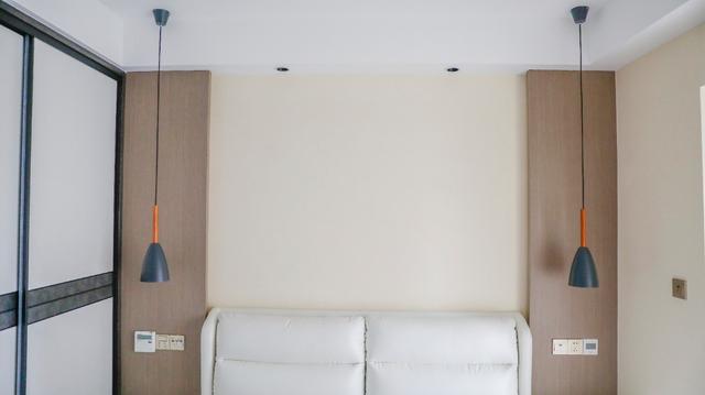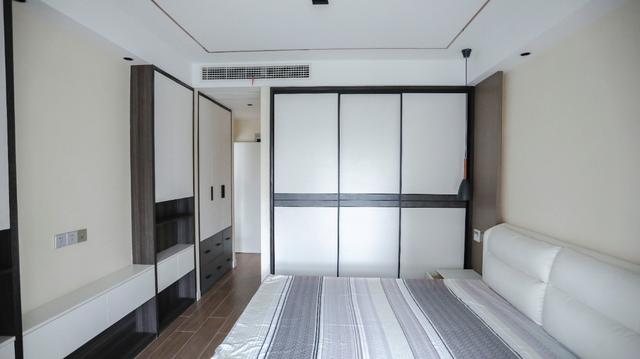 ▲主卧以白色为主,灰色为辅,主卧由于空间充裕,做了很多的收纳,干净舒适。床头灯做了吊灯设计,很时尚很高级。