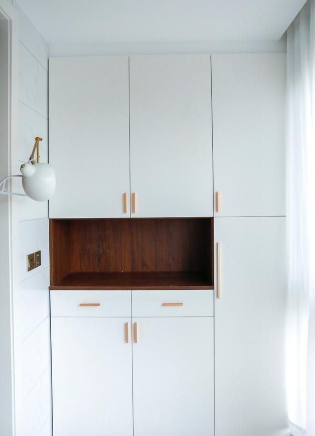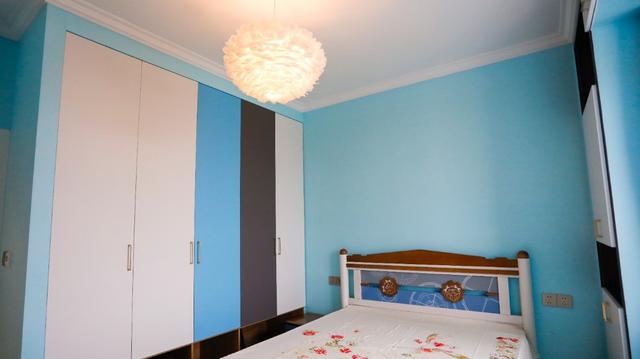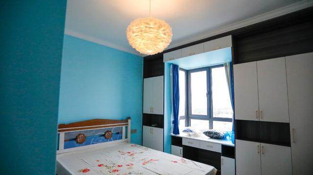 ▲这个次卧是蓝色为主,柜门用了不同的颜色搭配,非常活泼跳脱。飘窗改造成了写字桌,满足日常学办公,两边也改造成了橱柜便于收纳。可以说对空间的利用非常满了。