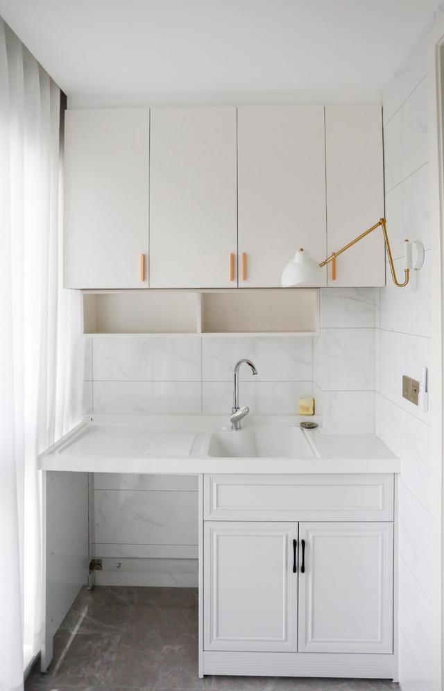 ▲阳台也是以白色为主,配上白色轻柔的窗帘,让人一看就非常舒适。一边是水池,一边是收纳,相互对应又互不干涉,两个造型感十足的壁灯,给这个空间增色了不少。