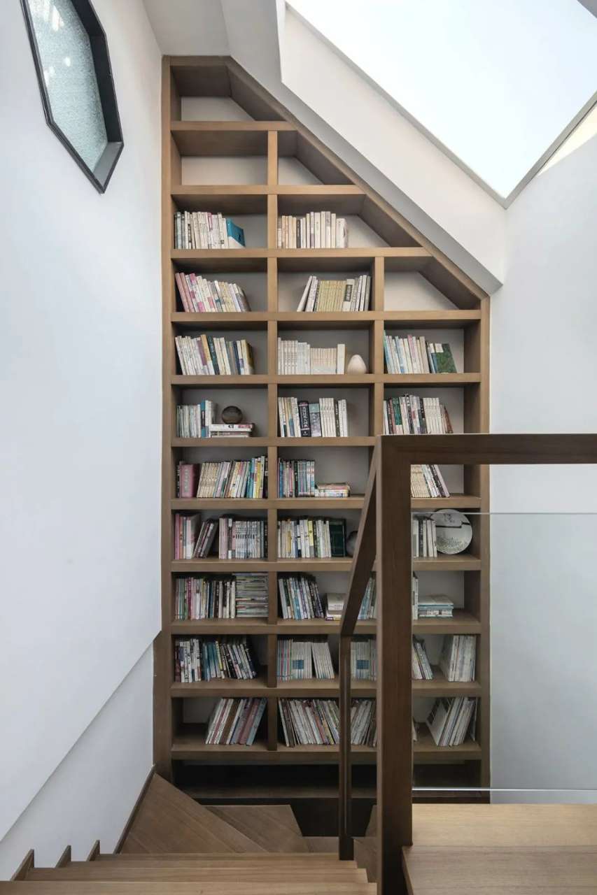 特别设计在楼梯转角位置装上一面到顶的书架,顶部摆放收藏的书籍,下方放置常看的书籍,坐在木质楼梯上就能享受到阅读的乐趣。