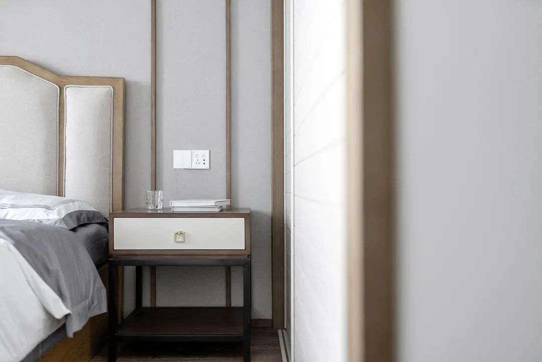 侧边的床头柜,深色底架、木色台面、白色抽屉,在简雅的床头墙呼应下,显得格外的简约舒适而大气。