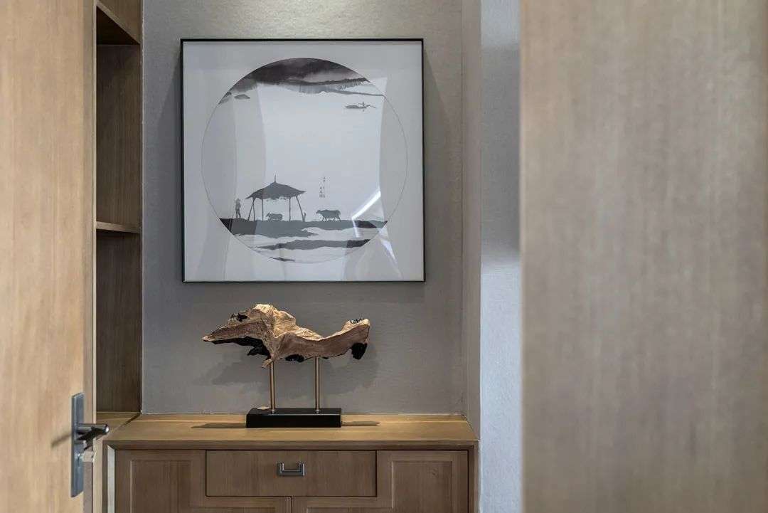 角落位置布置斗柜,柜台上布置摆饰品,上方一幅方形诗意的装饰画,侧边还有开放式的收纳柜,整体实用而不失韵味感。