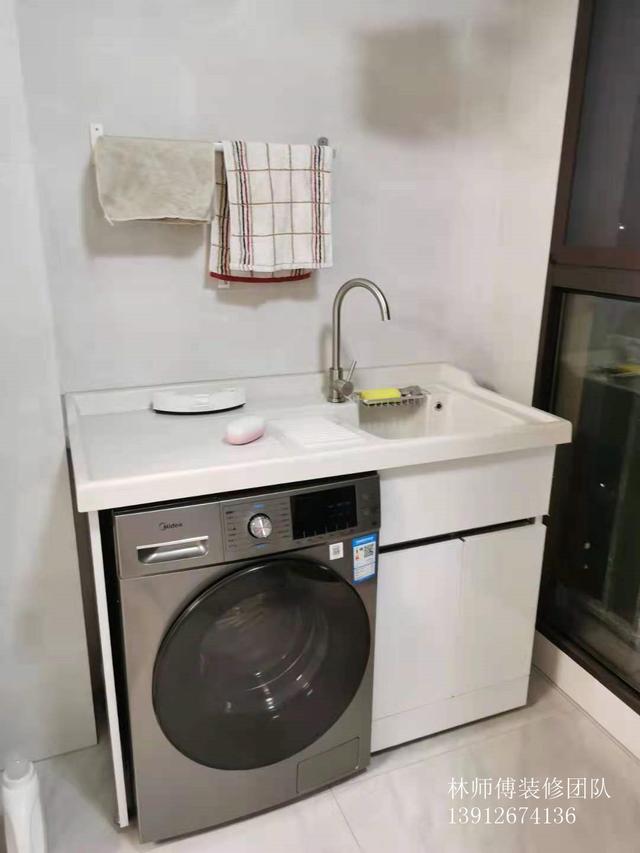阳台主要是晾晒,台面、柜子、洗衣机整体统一,收拾的非常清爽。