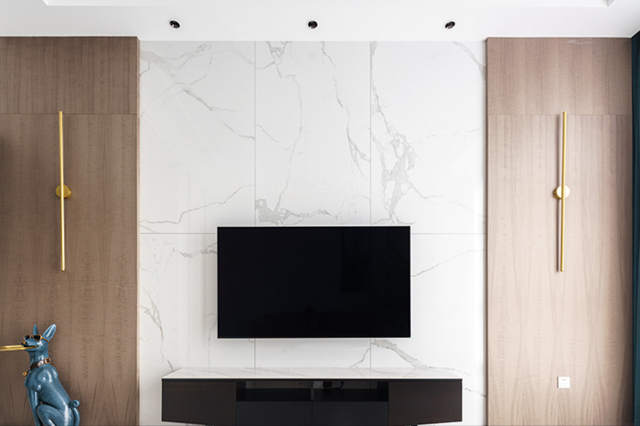 电视背景墙设计师是按照近几年比较流行的轻奢风格来花心思设计的,以大理石和木饰面做装饰,木饰面上方考虑了黄铜材质做点缀,瞬间让轻奢感凸显出来。