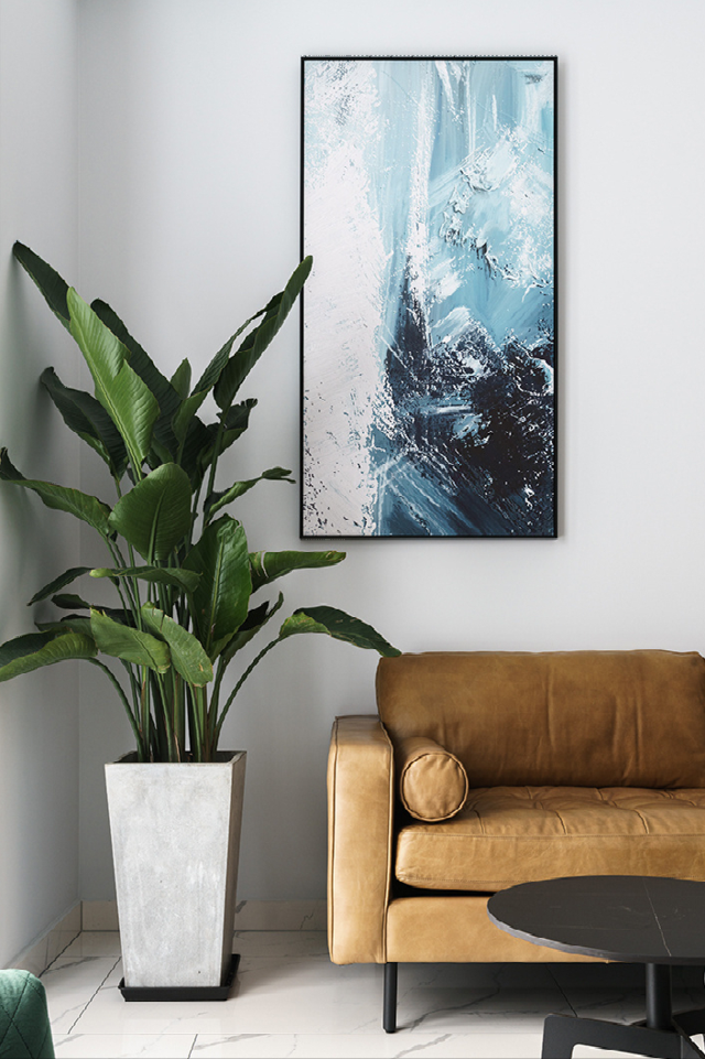 沙发的右手边放置一盆绿植做点缀,茶几是考虑了岩板材质的,沙发墙选择了乳胶漆调制颜色,壁画做装饰,从简单中凸显出实用的功能。