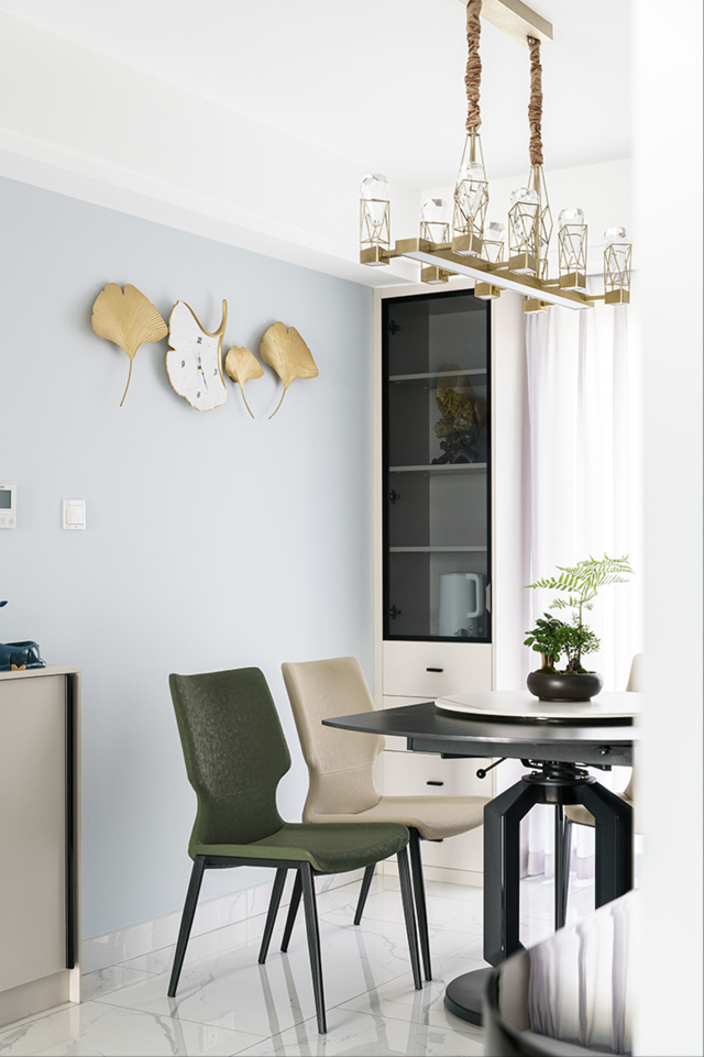 餐厅设计主要从家具以及软装方面上花了不少心思,餐厅墙面考虑了莫兰迪色系的乳胶漆,餐桌桌面材质是选择了岩板,黑色让餐厅空间瞬间变得更加稳重,抹茶绿色的餐椅和乳白色的餐椅相互结合起来,让餐厅空间瞬间变得更加丰富。