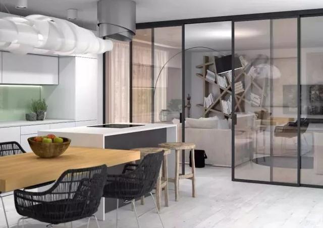 厨房、餐厅、客厅等公共区域的推拉门设计,一般会兼顾区域划分和保持通透性这两大功能。人们大多会采用透光的玻璃材料,让空间根据自己的生活需求或分或合,灵活切换。