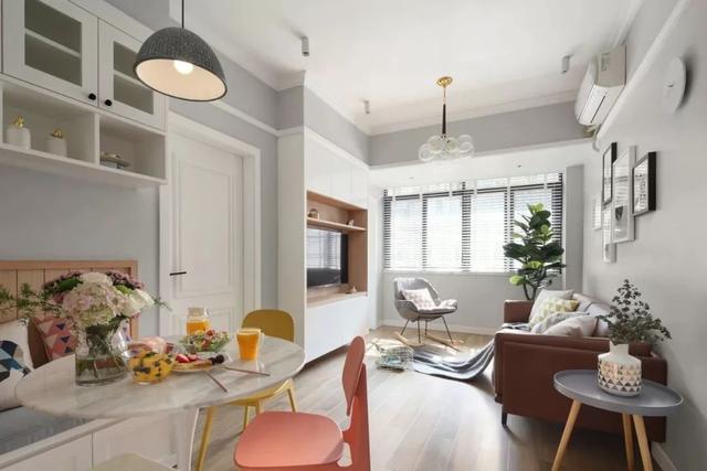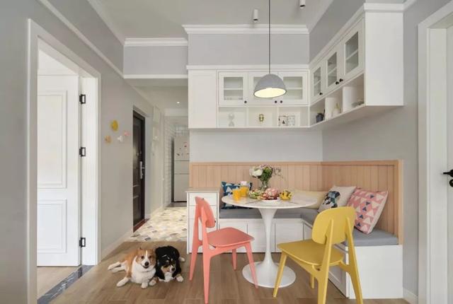 进来就是餐厅了,L型卡座餐厅设计,搭配彩色餐椅组合出不同的时尚感,餐厅吊柜和卡座地柜设计,以收纳为主,省去餐边柜空间。