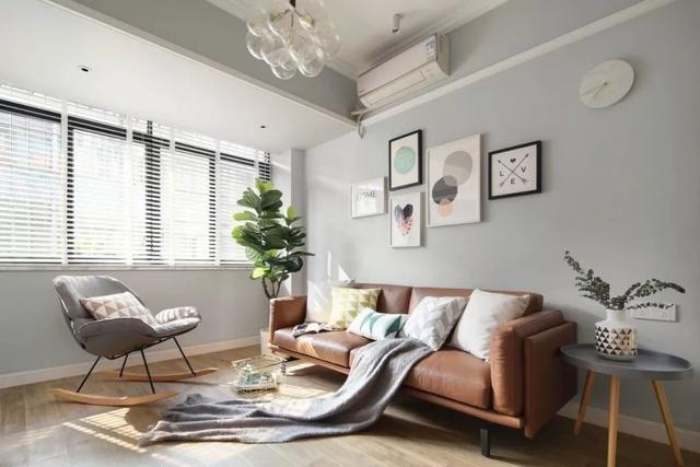 沙发是高级质感的皮质沙发,客厅舍弃茶几多出活动区域,空间显大,背景墙用几何形状主题挂画装饰,更有现代艺术感。