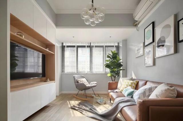 嵌入式电视设计,背景墙周边是收纳柜设计,原木色搭配纯白,简约清新。