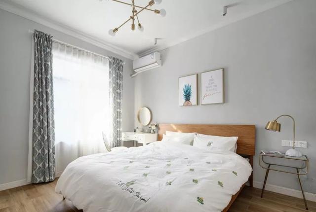 主卧装修十分简单,没有做吊顶设计,全屋以灰色为主色调搭以原木床和地板,大气简约。
