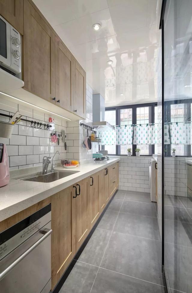 狭长的厨房空间打造成一字型布局,灰色地砖耐脏又经典。