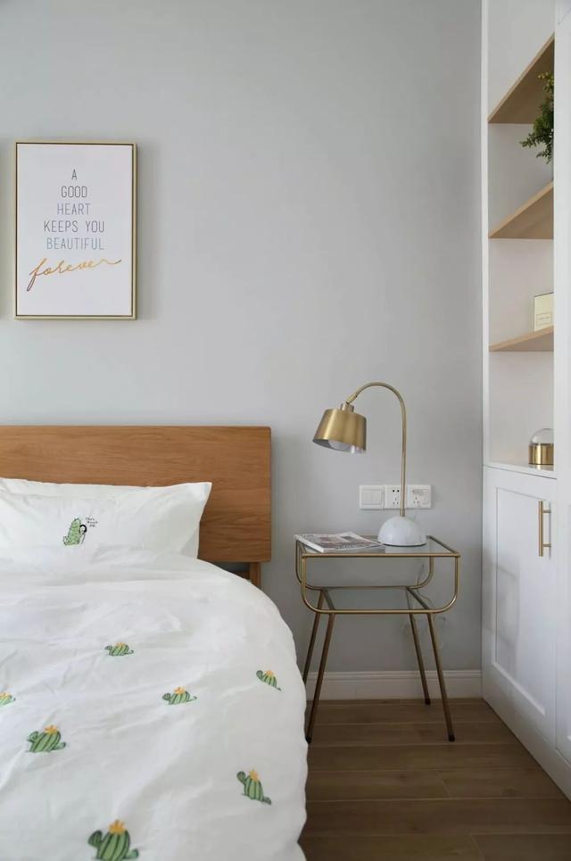 仙人掌绿植床单,细节也可以看出业主的心思,金属床头柜和台灯选择,低调小轻奢。