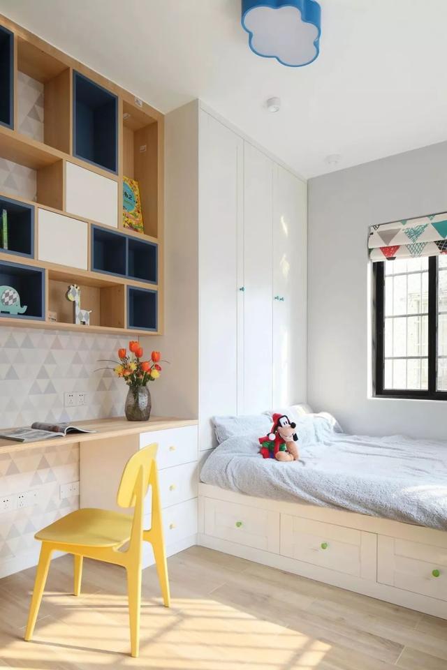 次卧是儿童房,为了省出空间设计书桌,儿童房舍弃床的空间,做定制榻榻米+衣柜设计,既有更多的储物空间,又能留出更大的空间方便孩子玩耍。
