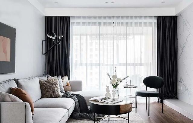 客厅灰白两色构成,整个空间的背景基调,黑色贯穿的家具框架,与深色窗帘的勾勒,强化着空间的立体感与层次性。