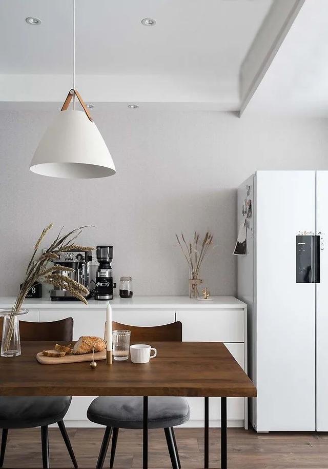 由于厨房的空间有限,因此把冰箱放置在了餐厅,在这个空间使用频率也会更高一些。