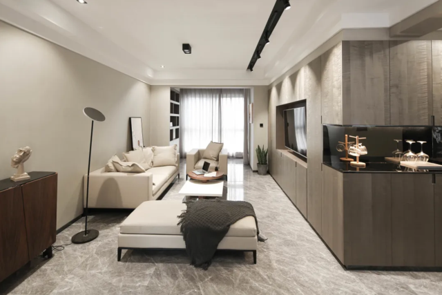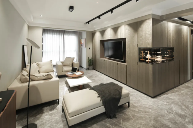 ▲客厅在天花四周做了一圈简洁大方的吊顶,无主灯的筒灯+导轨灯组合,在现代风的空间下,呈现出一种舒适优雅的空间氛围。整体地面以灰色大理石材质的地砖,布置米白色的皮沙发,定制柜作为电视墙的设计,带来的效果是自然舒适而大气。