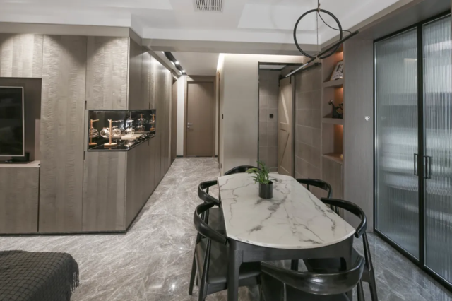 ▲餐厅区域的侧边墙面还加入了壁龛,布置展示品提升空间的华丽感。中间黑色的餐桌以白色大理石为台面,搭配上深色皮艺坐垫的餐椅,也营造出一个端庄优雅的用餐空间。
