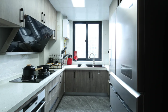 ▲厨房空间大小刚好,布置U字形操作台,对开门的大冰箱,定制木色的橱柜,让做饭空间显得更加实用而简约大方。