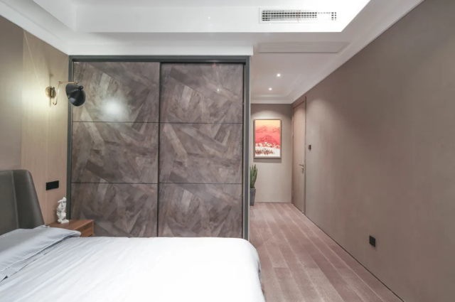 ▲卧室整体咖灰色的墙面空间,定制的衣柜也是以欧松板的柜门样式,让空间显得更加有趣。