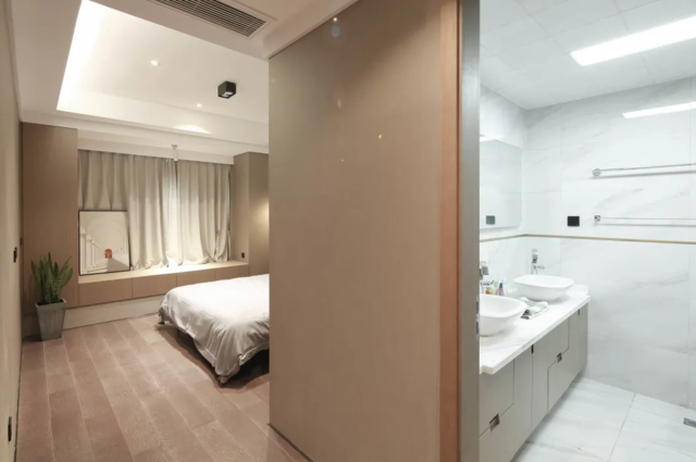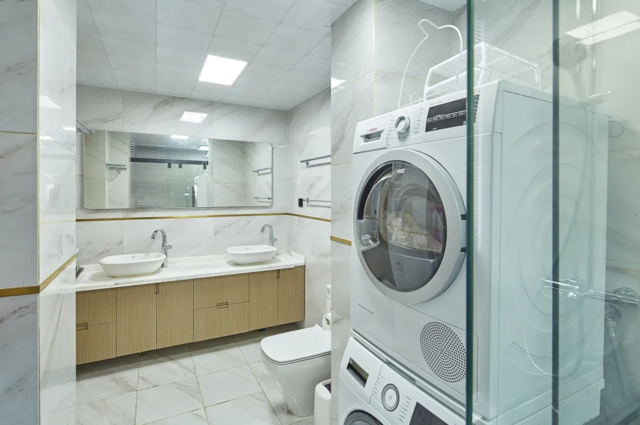 ▲雅白色的卫生间,定制双人位的木色洗手盆柜,在淋浴房与门厅之间加入洗衣机+烘干机的组合,整体空间显得实用优雅而大气。