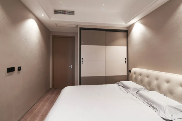 ▲次卧也是咖灰色的墙面空间,布置上一张米白色的皮艺床与白色素雅的床单,衣柜是双拼色的推拉门柜体设计,整体空间舒适温馨而实用大方。