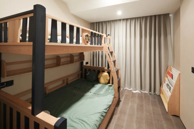 ▲儿童房采取上下床的设计,木质的床架基础,加入黑色的组合,显得更加独特。