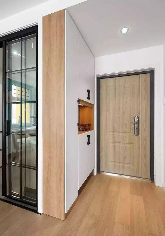 玄关内嵌一面墙的白色储物柜,留空处用不同颜色区分,用于放一些常用的小物件。最底下留了一个位置放经常换穿的鞋子,简单的设计却很实用。