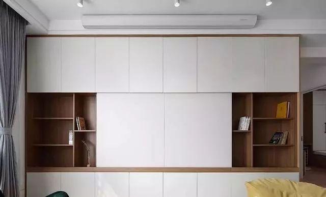 电视墙打造了一整面收纳柜,当作书柜使用,电视隐藏在柜子里,想看电视的时候推开柜子就行,实用极了。