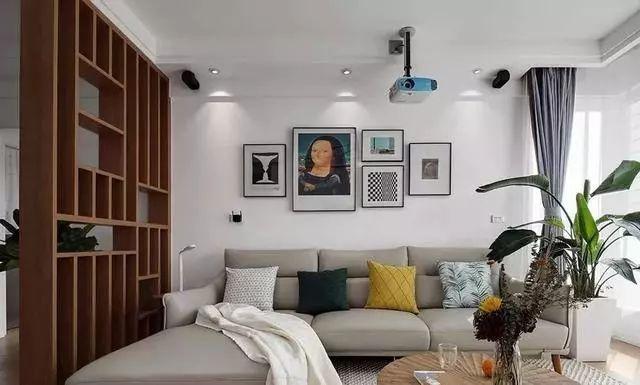 灰色L型沙发看起来时尚大气,旁边打造了一个实木置物柜,除了可以放装饰品起到装饰作用,也是起到一个隔断作用。