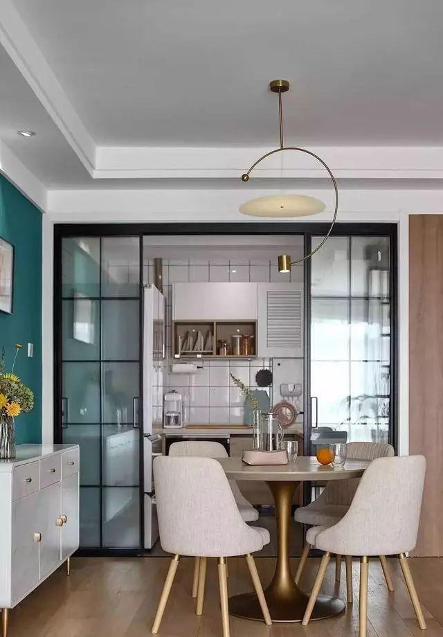 厨房和餐厅间用玻璃推拉门隔断,圆形餐桌居中摆放,两侧都有足够的通行距离,这样的动线不会有闭塞感。