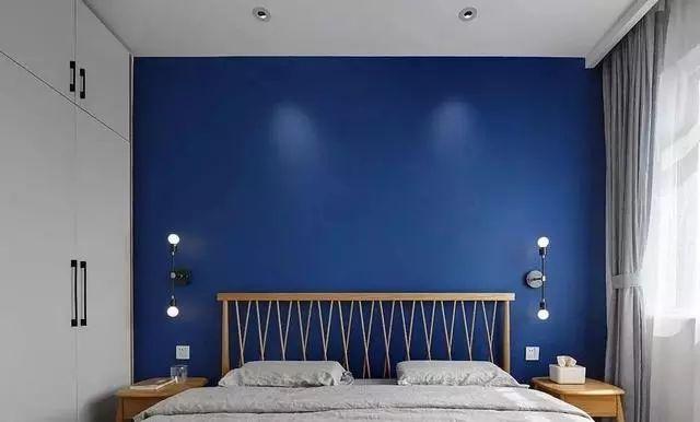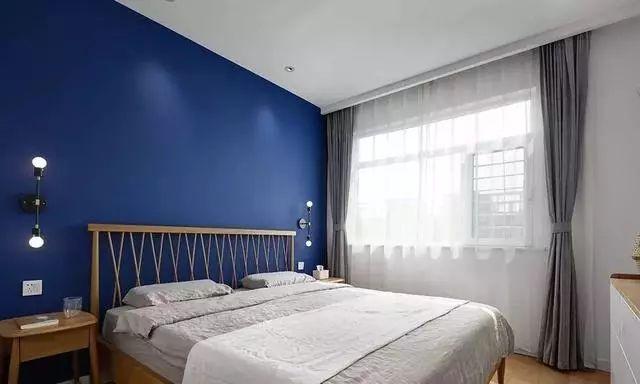 主卧床头墙选择了深蓝色,深蓝色给人一种宁静清幽的感觉,营造了一个良好的睡眠环境,原木线条床头,搭配黑色小壁灯,温馨自然。