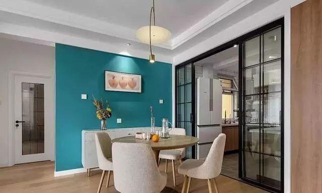 餐厅墙刷成浅蓝色,用挂画、绿植简单搭配装饰,既舒缓压力又充满活力,营造了一个清新浪漫的吃饭氛围。