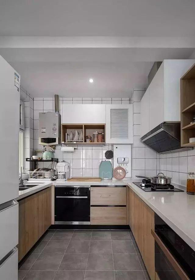 厨房U型格局,储物能力很丰富,最大程度的利用了每一平空间。冰箱放在一个小角落,便于拿菜。