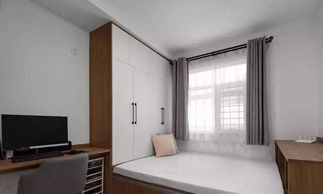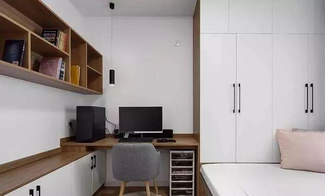 另一间房改造成多功能房,兼有书房和卧室功能,一边打造了组合书桌柜,剩下的空间打造榻榻米床和收纳柜,轻松实现空间的多种用途,相当实用。