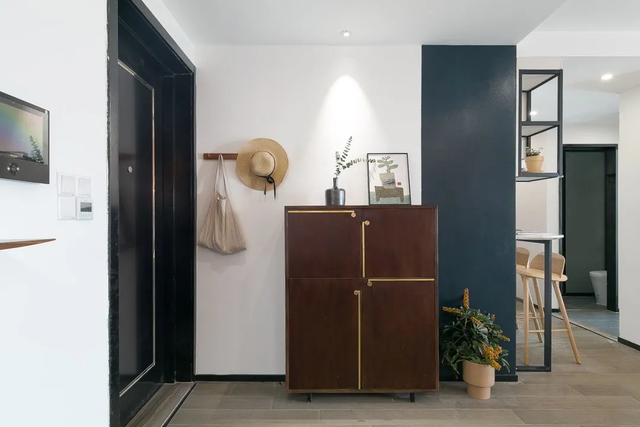 入户设计很简单,鞋柜+挂衣架,功能实用,占用空间少。