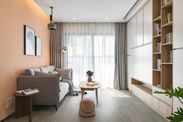 投影仪取代了不常用的电视,厚重的茶几替换成了细长腿桌几,轻盈通透。
