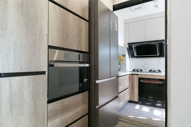 厨房采用半开放式设计,外面的过道定制储物柜,嵌入小家电。三折推拉门隐藏在冰箱侧面,美观通透,还能有效隔绝油烟。