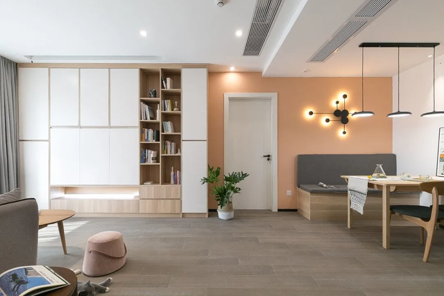 客厅打破常规布局,无主灯设计简洁干净。一整面墙的储物柜,兼具收纳和展示的功能。