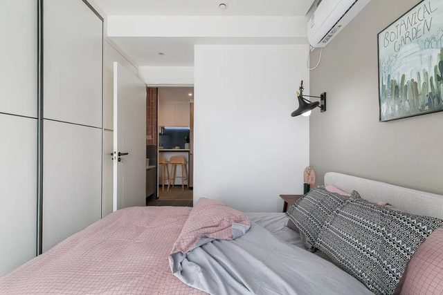 主卧温和静谧,空间虽小却倍感温馨。灰白色基调点缀小面积粉色,让舒适感更强。